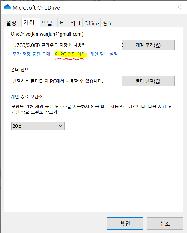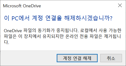 4. 이 PC에서 계정 연결을 해제하시겠습니까? 창에서 계정연결 해제를 누르시면됩니다.