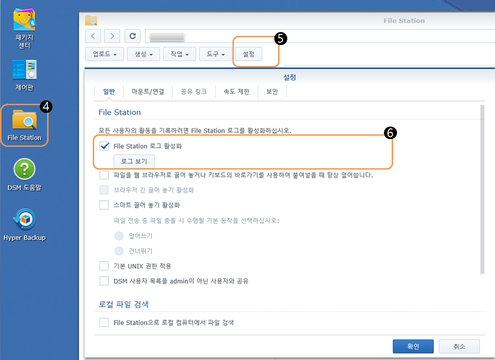 ④ File Station을 선택 -> ⑤ 설정을 선택 ⑥ File Station 로그 활성화