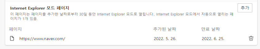 Internet Explorer 모드 페이지에 추가 버튼으로 IE 모드에서 사용할 사이트를 입력합니다.