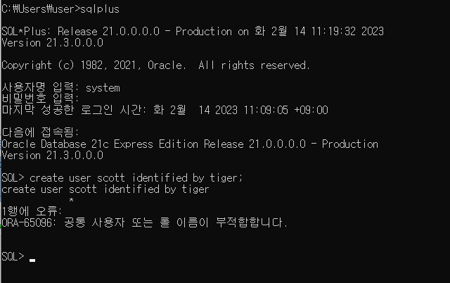 system 계정으로 로그인후 사용자 생성을 하면 아래 에러 메지지가 출력된다.