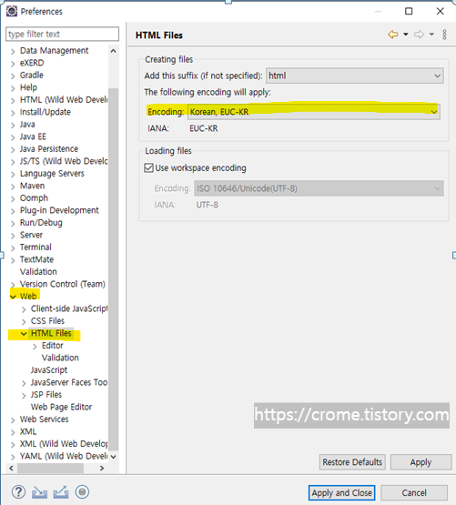 eclipse 메뉴에서 Windows > Preferences > Web > HTML Files 우측 Ecoding 부분을 UTF-8로 변경