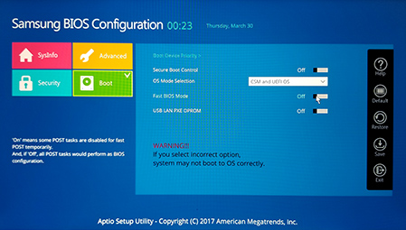 [주의] INTEL 8세대 CPU를 채용한 삼성 컴퓨터부터는 대부분 CSM OS 메뉴가 없어졌습니다.