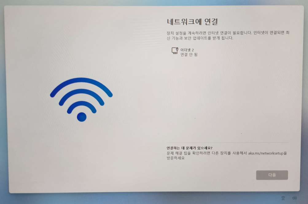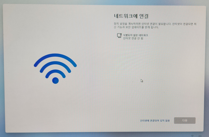 windows 11 설치 시에 네트워크 연결 화면에서 더 이상 진행할 수 없습니다.